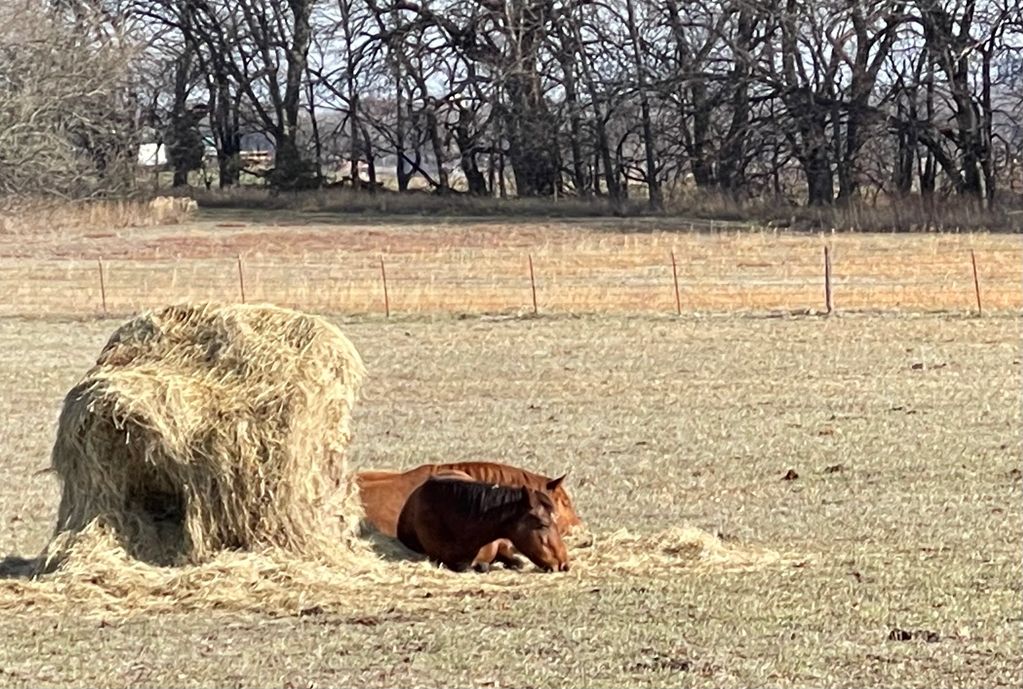 A gorgeous winter day! Valentina (front) and Lily doze in the sun with the hay bale providing shelter from the wind.