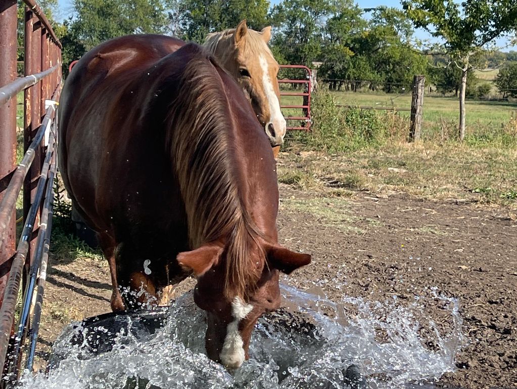 Kai can be counted on for extra fun while filling stock tanks. Besides Lily, Kai is our biggest water baby. Tex, behind Kai, will rarely play with the water. In fact, if we move a hose while he is eating his meal, he will give a look and step away.